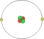 Man ställer upp teoretiska förklaringsmodeller för att förstå och tolka verkligheten. Detta är till exempel en mycket enkel modell av en Helium-atom, där de röda är protoner, de gröna neutroner och de små gula är elektroner: